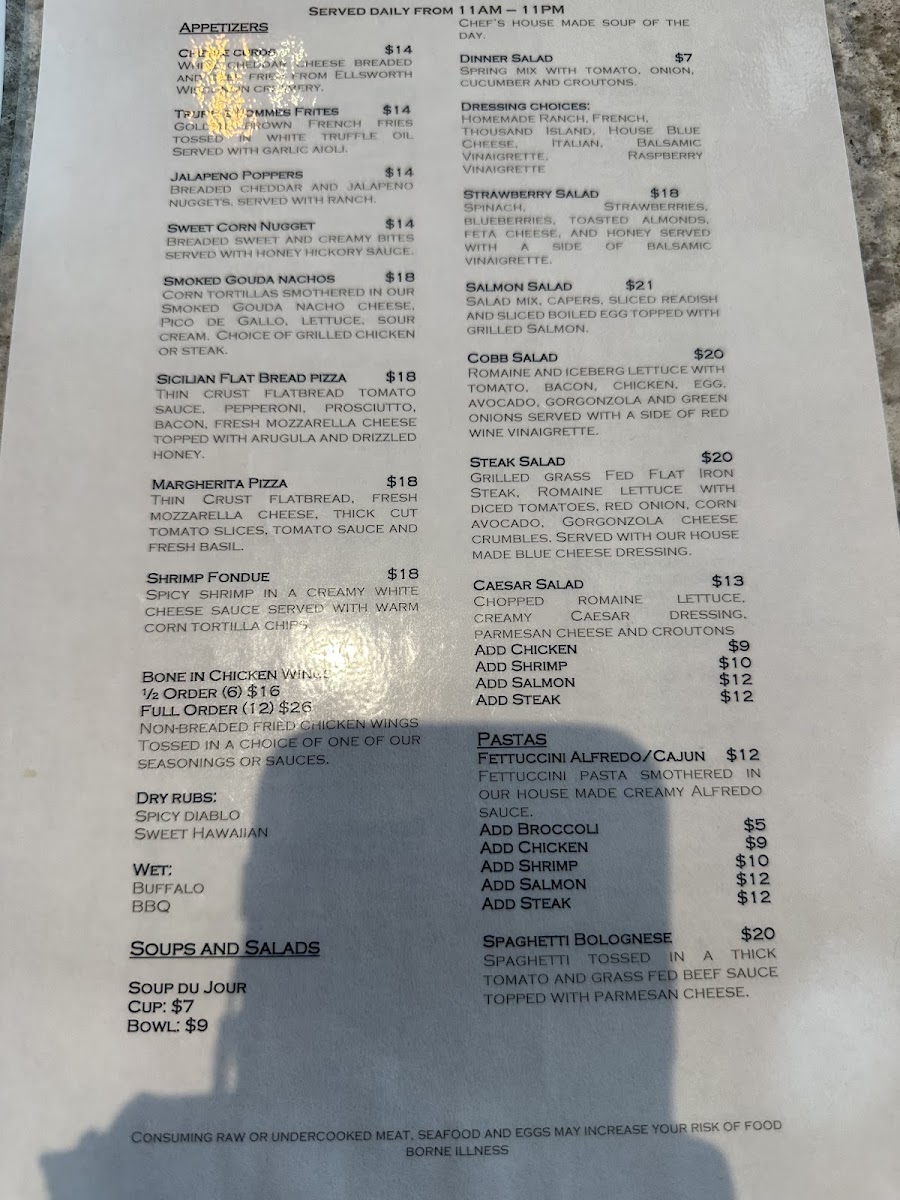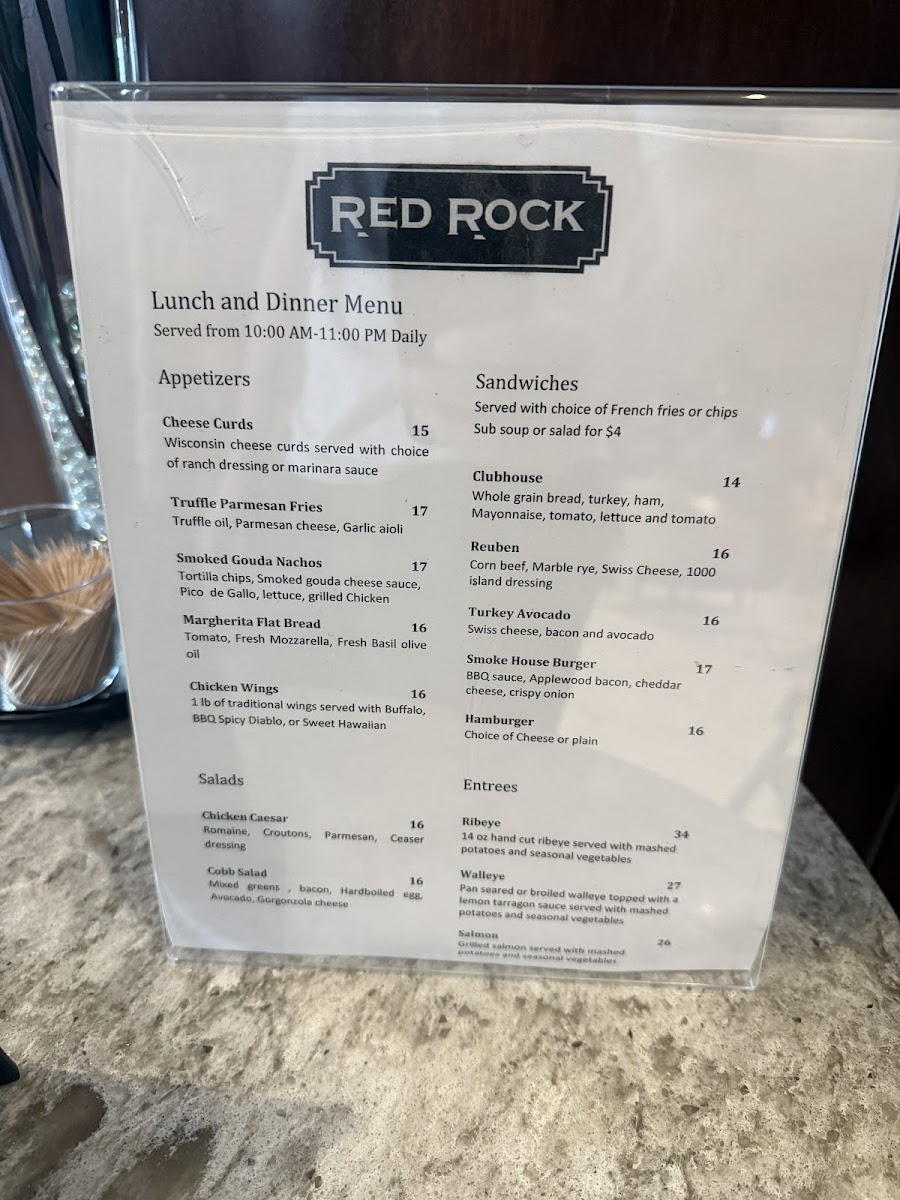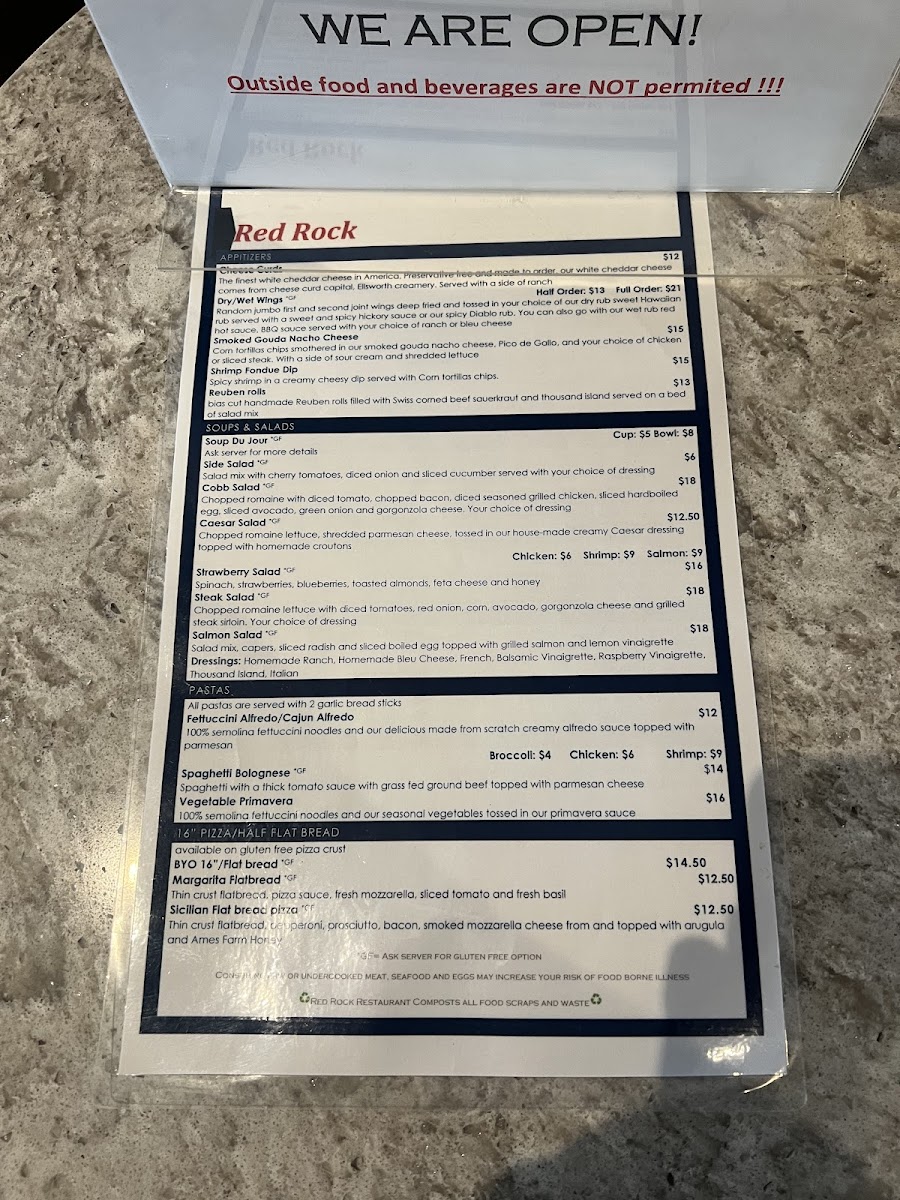 From a reviewer’s perspective, the menu at Red Rock Bar and Grill offers a well-rounded selection that covers classic American comfort food with a few elevated touches. The appetizer lineup, including Cheese Curds, Truffle Parmesan Fries, Smoked Gouda Nachos, Margherita Flat Bread, and Chicken Wings, sets a strong start with familiar favorites and shareable options. The sandwich section features hearty choices like the Clubhouse, Reuben, Turkey Avocado, Smoke House Burger, and Hamburger, while lighter options such as the Chicken Caesar and Cobb Salad provide balance. For more substantial meals, entrees like the Ribeye, Walleye, and Salmon stand out as classic dinner selections. Pasta lovers can choose between Fettuccini Alfredo/Cajun and Spaghetti Bolognese, and pizza fans have options like Byo 16"/Flat Bread, Margarita Flatbread, and Sicilian Flat Bread Pizza. Additional items such as Smoked Gouda Nacho Cheese, Shrimp Fondue Dip, and Reuben Rolls add variety, making the menu diverse enough to appeal to both casual diners and those looking for a more filling meal.